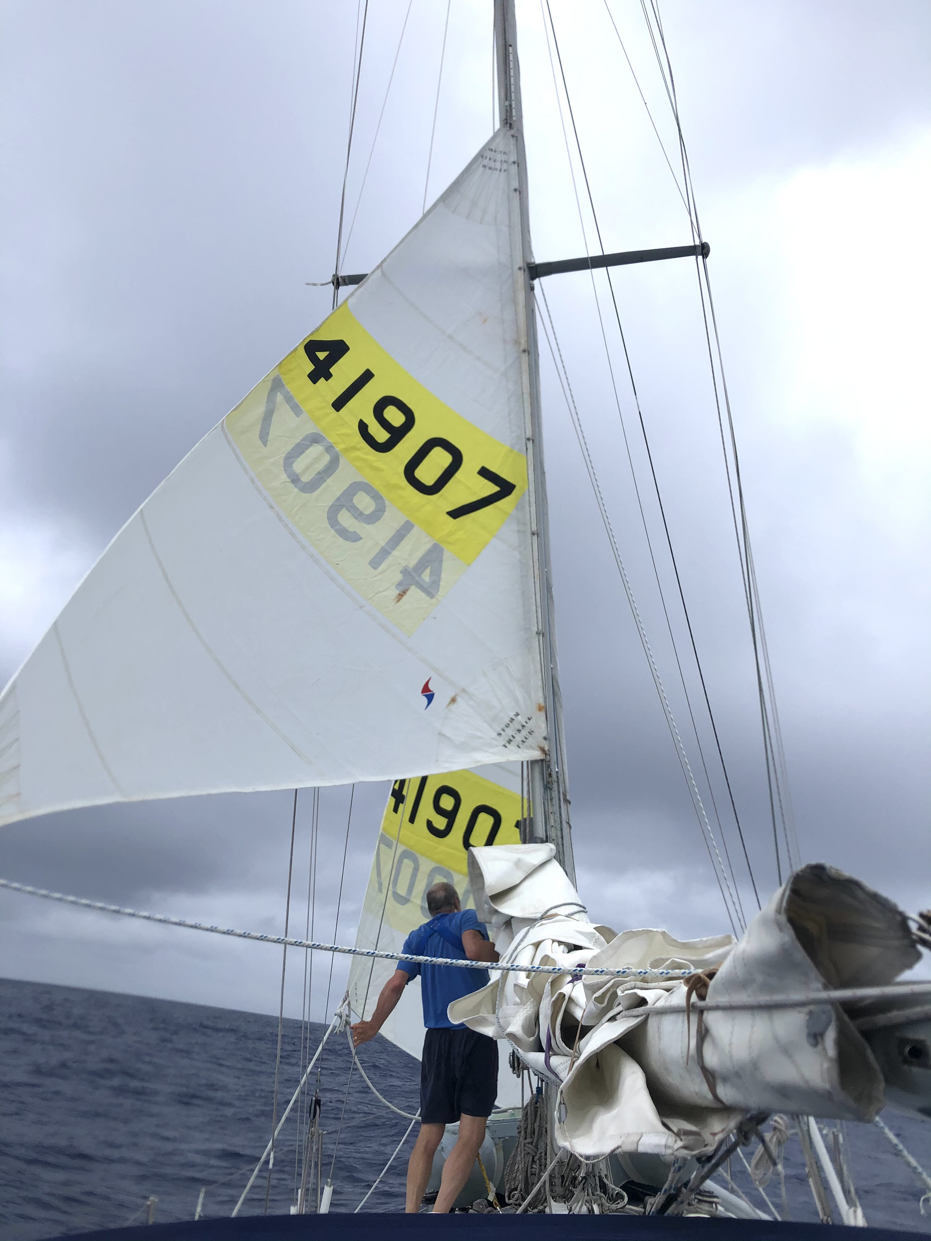 As evening approached Captain Max created a different sail configuration to accommodate being hove-to in a serious amount of wind: the main sail was lowered and tied down; a trisail hoisted on the mast instead; and, a storm staysail replaced the staysail we’d been flying. (Being hove-to is a way to “park” the boat with the jib pulled to windward counteracting the trisail. The boat gently gives way to the waves as it slowly drifts at about 1 knot of speed).