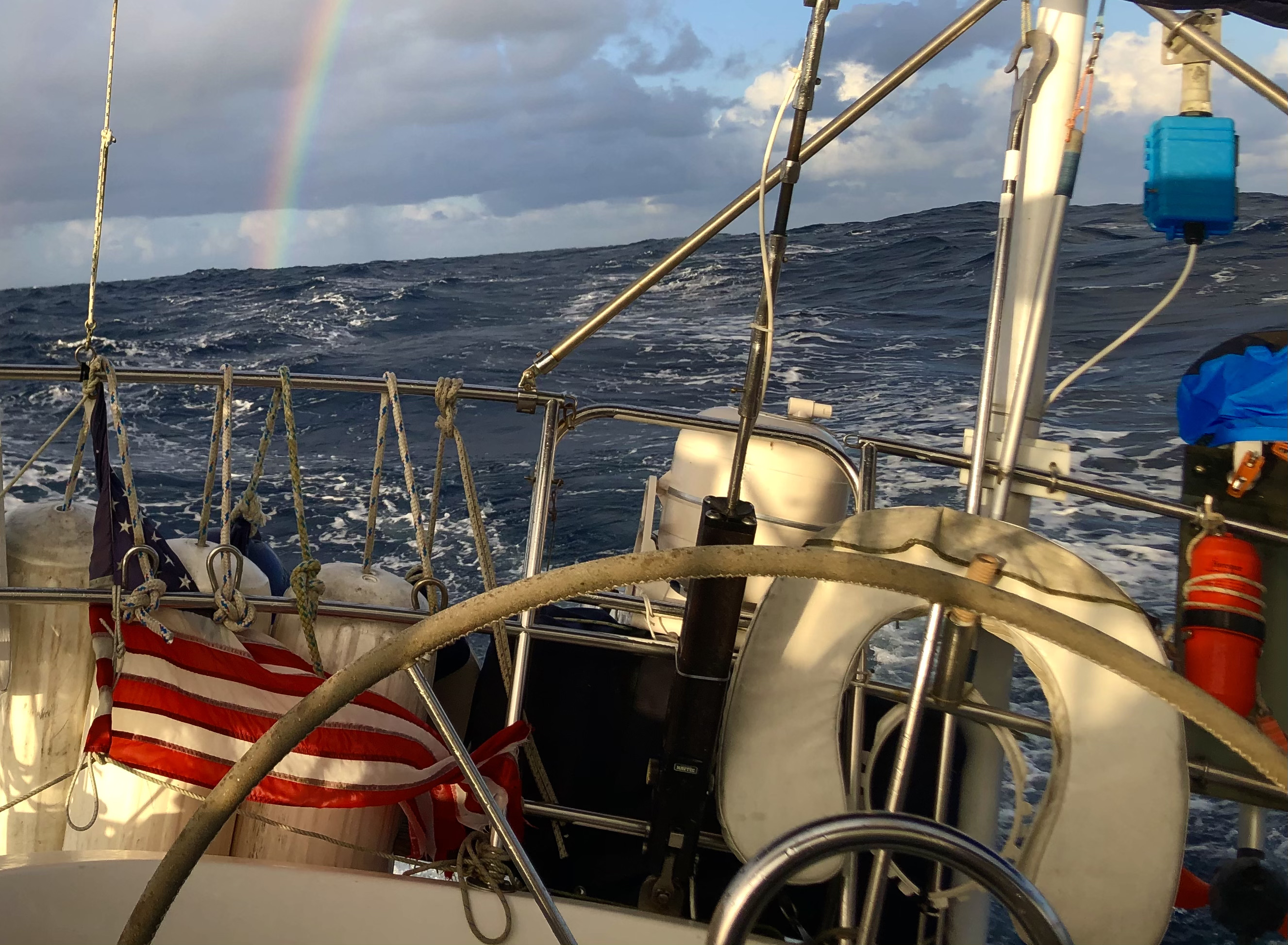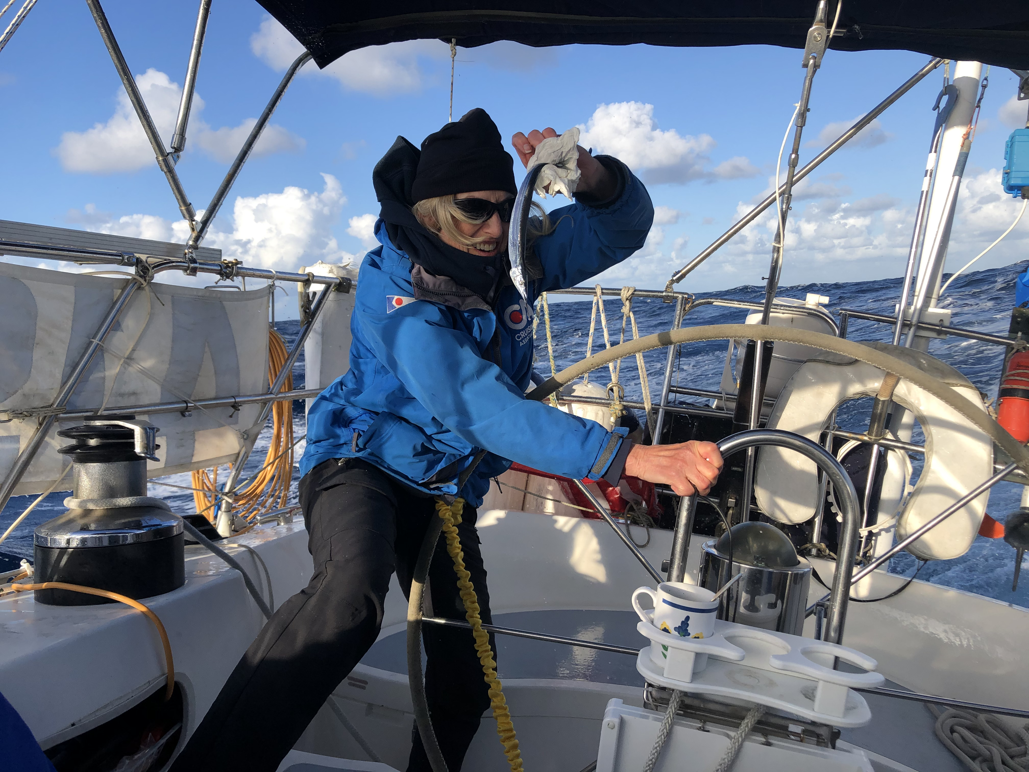 On that glorious note I’ll sign off. But, will leave you with a visual of the three of us sitting below enjoying our one-pot meal last night. That is until King Neptune decided to up our winds. As forecasted, the wind accelerated from low 20s to over 35 knots before any of us could complete “what the——?!” as we abandoned our dinner and started stuffing our bodies into rain gear.