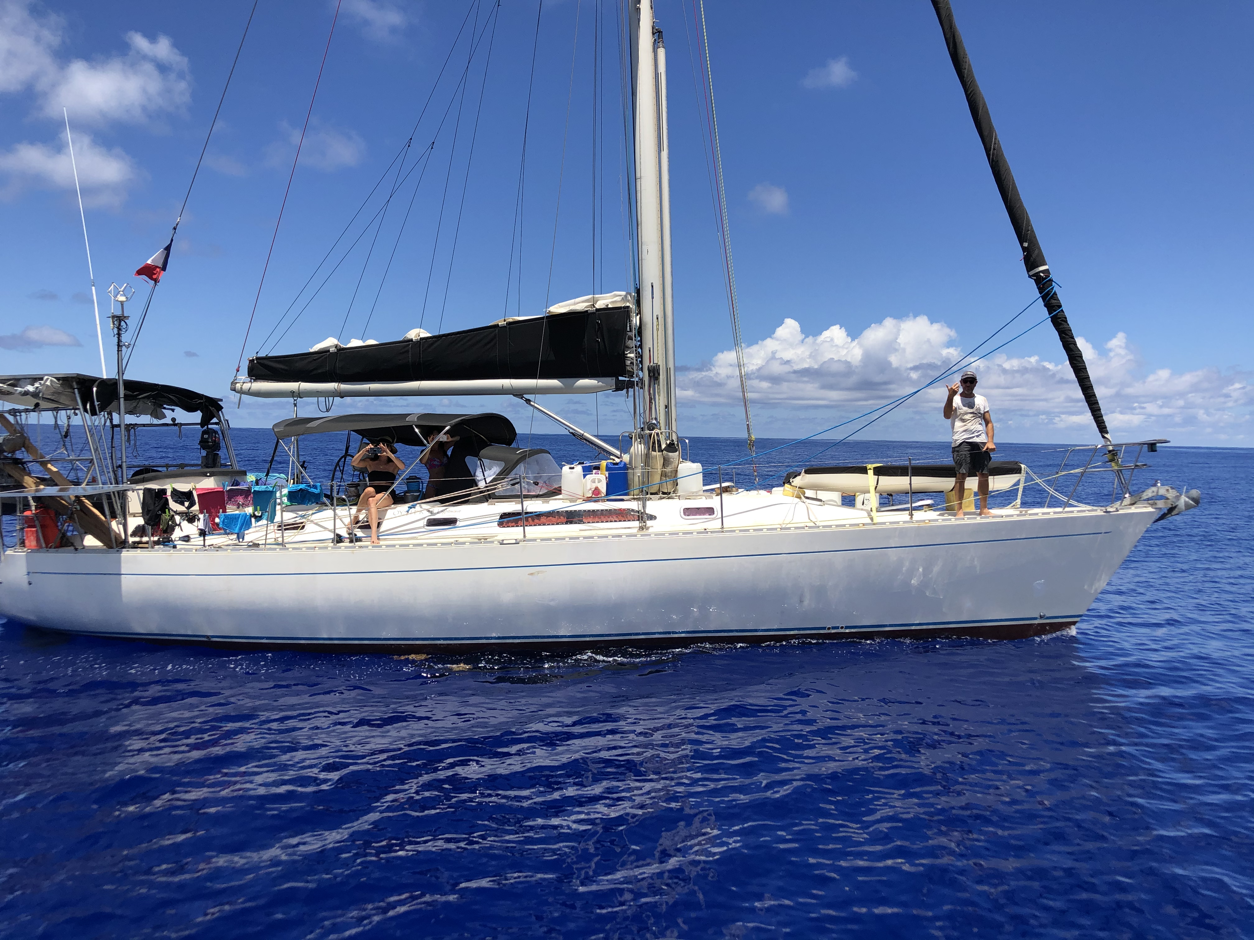 Thursday afternoon we spotted a sailboat heading East. Lynnie hailed them on the radio and they changed course to come say hi to us. They were French, bound for the Azores. It was a fleeting but heartwarming moment of smiles, waves and picture-taking from a chance meeting of kindred spirits on the high seas. Soon we were each back on our separate ways.