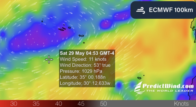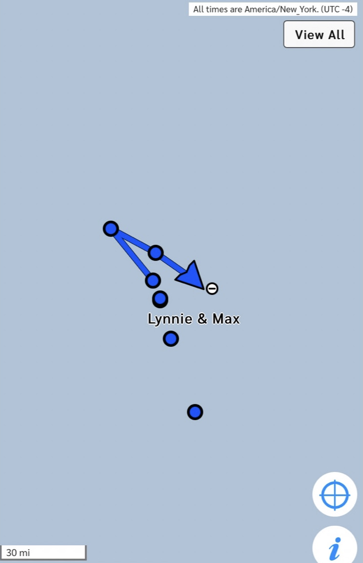 We decided to forego a stop at Bermuda. We don’t need any fuel, and a serious weather system has brought rough winds and seas from Bermuda northward. Even if we’d wanted to stop we would have struggled to get into Bermuda in the strong winds. Instead, we bided our time the past couple of days, intentionally slowing the boat to stay in less wind south of Bermuda and let the system go by. This morning in 20-24 knots of wind we set our course towards Maine. We anticipate a few days of robust SW winds for which we have swapped back to our smaller 100% jib.